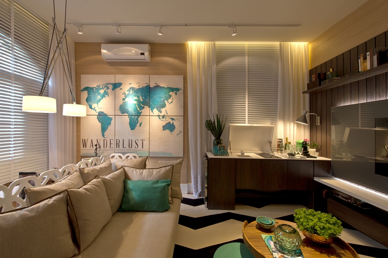 O Quarto Hostel, da arquiteta Estela Cislaghi, foi inspirado na comunicação globalizada e feito para quem gosta de viajar e de receber. O ambiente de 20 m² foi pensado para transformar um cômodo disponível em um espaço completo, com copa, closet, sofá cama e bancada multiuso, além de usar equipamentos de última geração, como o home teather e automação. Destaque a decoração com obras da artista Cassia Acosta e um painel de mapa mundi, feito exclusivamente para a mostra. O sofá cama hostel e o biombo são lançamento e dão um ar multiuso para o ambiente, que pode ser usado como quarto e como sala. A automação é um aliado importante no espaço, controlando a iluminação do ambiente e a climatização por meio de display e dispositivo móvel.