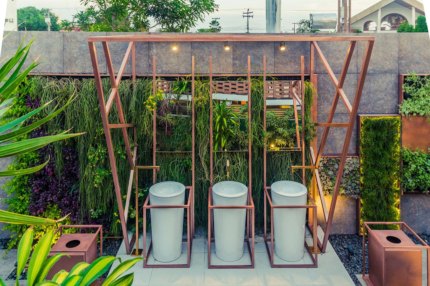 29/33 CASACOR Paraíba 2016. Jardim dos Lavabos – Ana Cristina Batista, Aucélio Monteiro Filho, Daniella Figueiredo, Maria do Socorro Fernandes e Yuri Fernandes. O cobre é o elemento central do projeto, matéria-prima da estrutura desenhada para abraçar as cubas e alguns nichos na parede, de onde parte um exuberante jardim vertical. ()