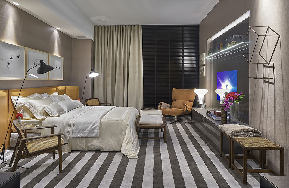 47/47 CASACOR Minas Gerais 2015 | Suíte master e banho: Márcia Carvalhaes. O melhor do design brasileiro vem representado nas cadeiras, bancos e poltronas distribuídos no espaço, sobre o tapete bicolor que reveste toda a área. Nas paredes, a textura de tecido confere aconchego, assim como a iluminação que cria recantos para relaxar. Outro destaque é a cabeceira da cama em couro pespontado. (Divulgação/CASACOR)