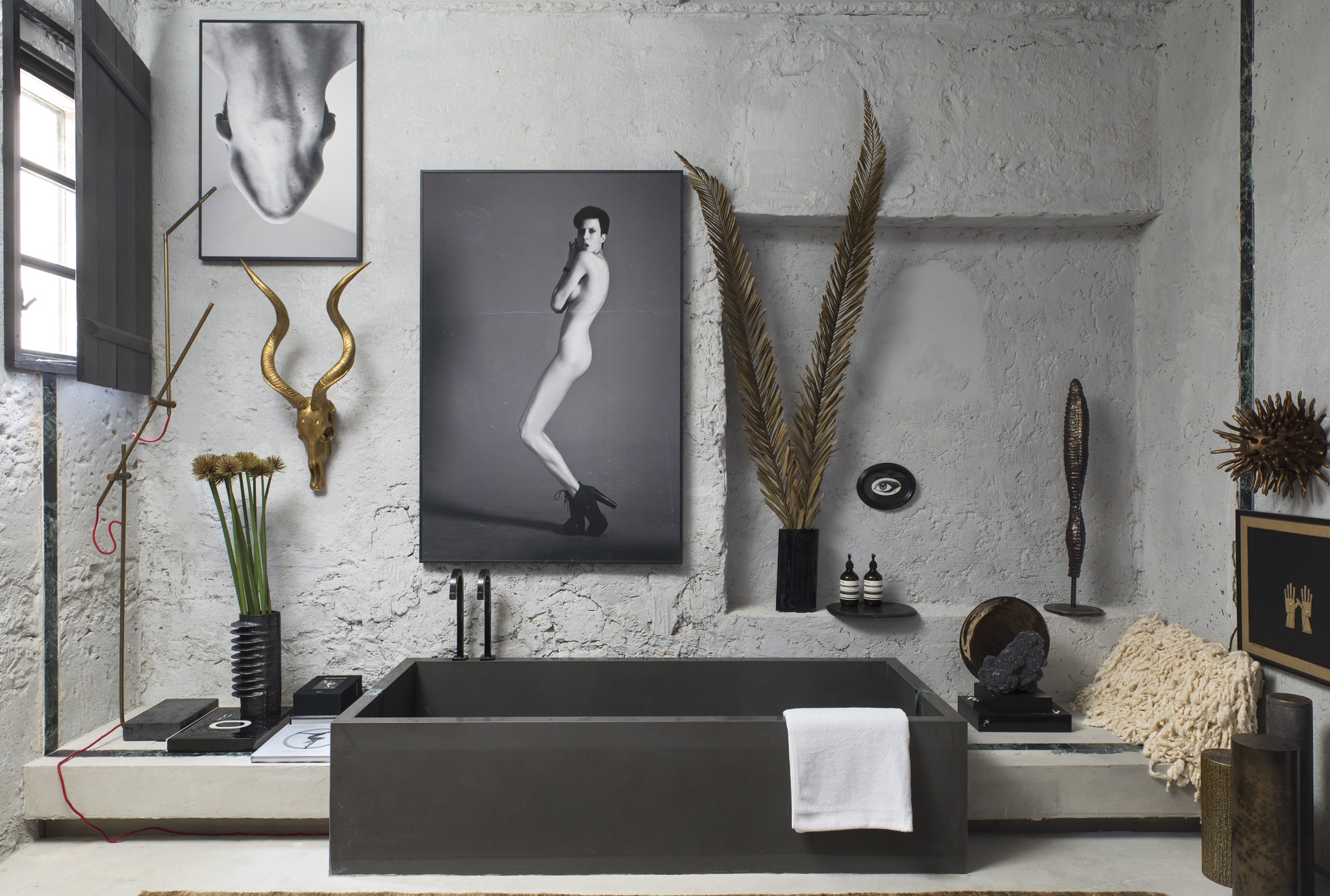 Outros itens ganham destaque na composição, como peças em galuchat, Black pen shell, 2 esculturas de Florian Raiss, peças de Fernando Akasaka e um grande par de chifres dourado acrescenta notoriedade ao espaço.