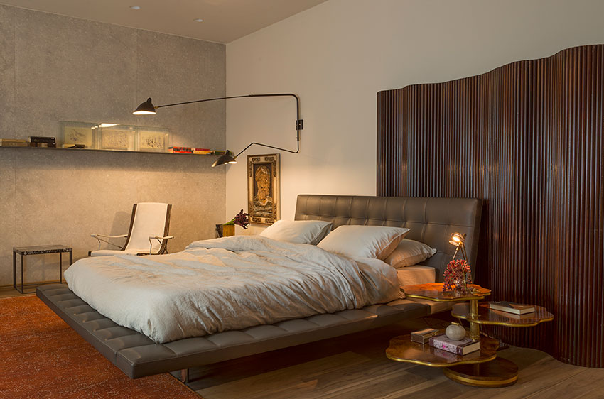 O espaço também variedade e versatilidade de peças de design, com peças como a cama em couro da Poliform e poltrona da B&B Itália, a poltrona de Oscar Niemeyer, a mesa lateral francesa década de 40, da Espaço Cardeal, e as mesas da Etel Interiores, que cumprem a função de criados.