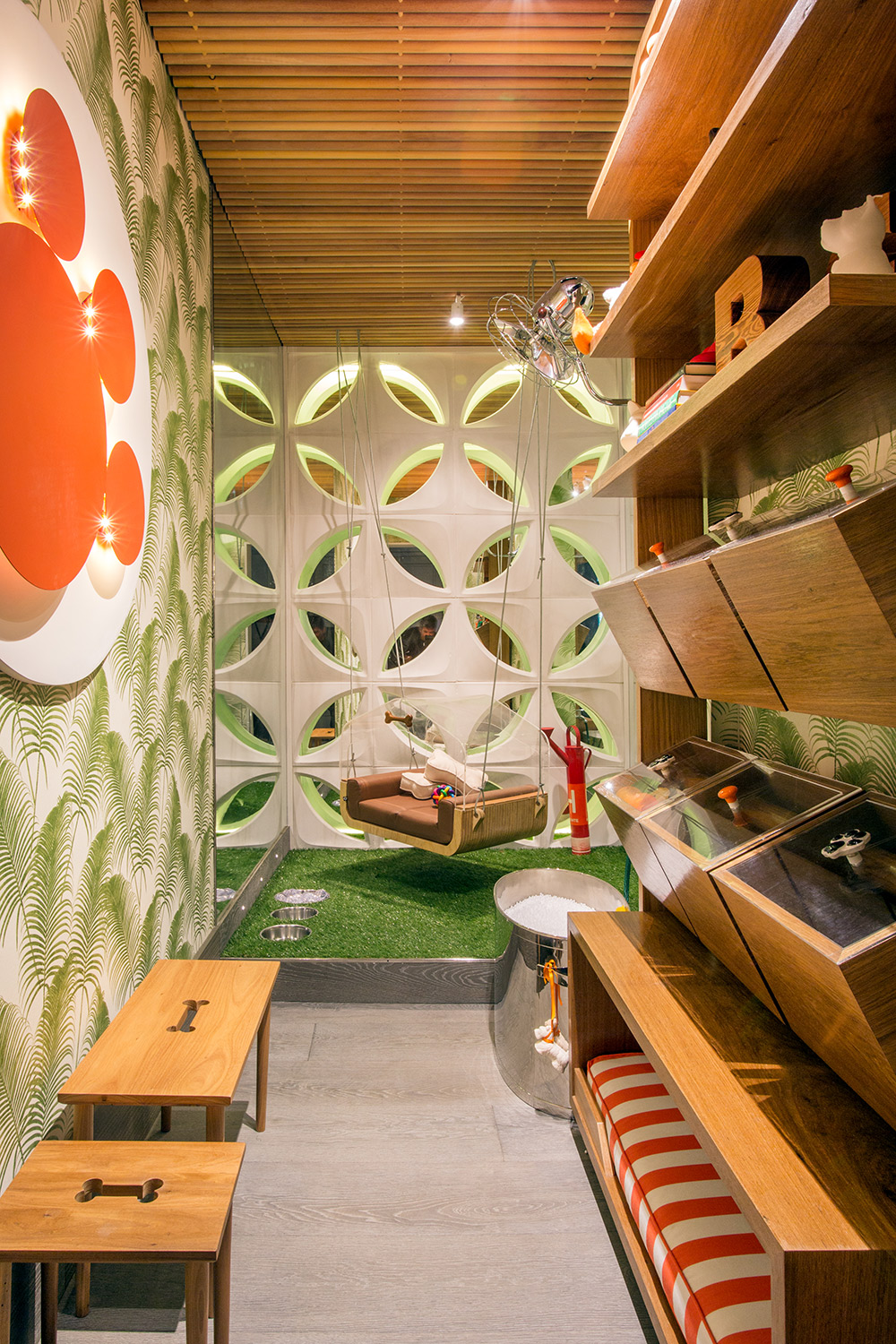 4/6 CASACOR Rio de Janeiro 2016. Lounge do Cachorro - Cristiana Mascarenhas e Mariana Mascarenhas. Os pets ganham um cantinho especial para relaxar depois da caminhada e receber todos os mimos. O elemento vazado, da Solariam, tem referência na arquitetura modernista, junto ao tablado forrado em grama sintética com comedouros embutidos. O balanço tem desenho exclusivo do Mula Preta Design. Já a estante guarda brinquedos e apetrechos caninos, ao lado da banheira de prata. ()