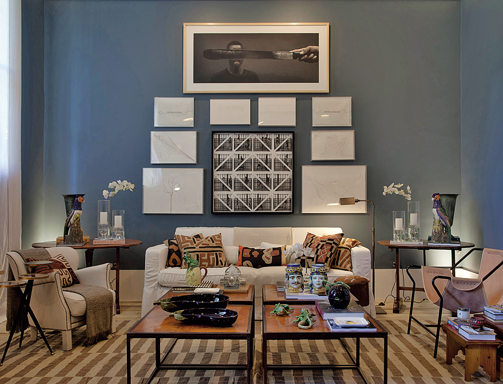 6/9 CASACOR Goiás 2016. Studio Nando – Nando Nunes. Duas colunas em mármore de cristal branco fazem a divisão simétrica do ambiente, que traz piso em porcelanato. As fotografias são do goiano Lucas Santos. A parede que compõe os dois lounges recebeu um painel de MDF com pintura em microtextura. ()