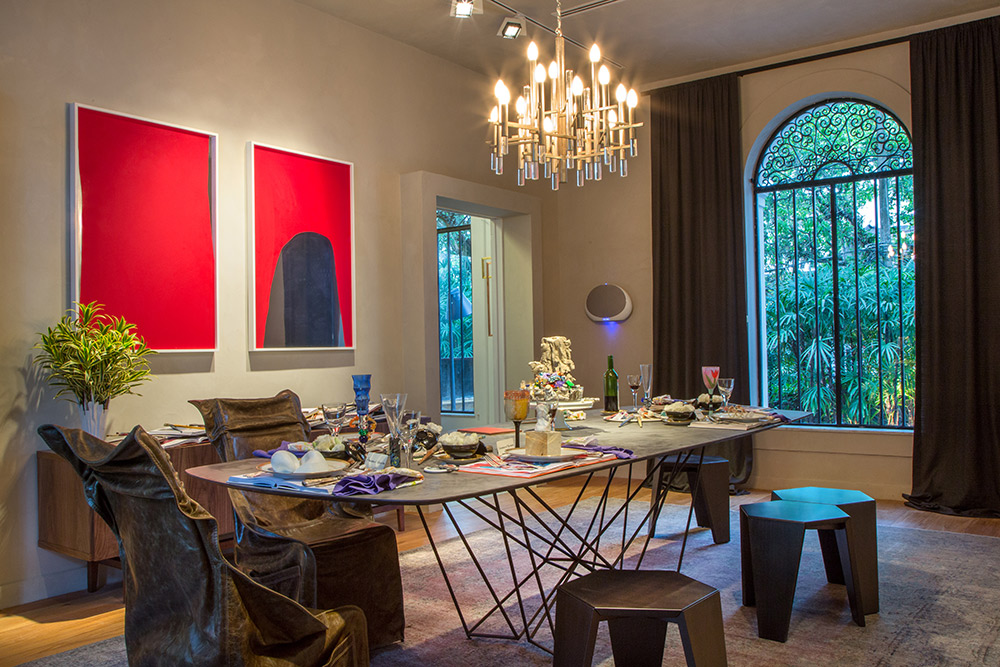 2/13 CASACOR Bahia 2016. Sala de Jantar - Marlon Gama. Os apreciadores de arte vão adorar o projeto, que aposta no design apurado dos móveis em interação com as telas expostas. Esses itens, que exalam contemporaneidade especialmente nos tons intensos de vermelho, ganham expressão diante da base neutra, formada pelo piso e pelas cores neutras originais do Solar. (Divulgação | CASACOR)