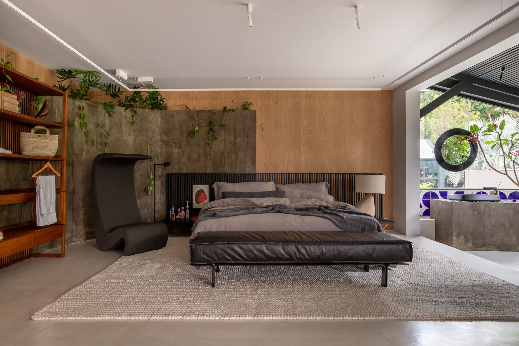 1/7 Casa 245 - Laís Galvão. O loft descomplicado foi inspirado no traço simples e genial de arquitetos como Oscar Niemeyer e Lina Bo Bardi. Os ambientes integram as funções da moradia, conferindo grande praticidade às atividades do cotidiano. O grande painel de concreto e madeira une os ambientes de sala de estar e quarto, proporcionando uma sensação de continuidade visual. (Gabriela Daltro/CASACOR)