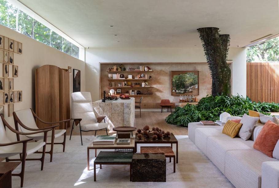 Um majestoso flamboyant chama a atenção logo que se entra na Casa da Árvore Renault: o tronco transpõe o pé-direito do estar e é a estrela do espaço de 280 m² assinado por Carolina Mauro, Daniela Frugiuele e Filipe Troncon, profissionais do Suite Arquitetos, que comemoram dez anos do escritório nesta edição da CASACOR São Paulo 2018.