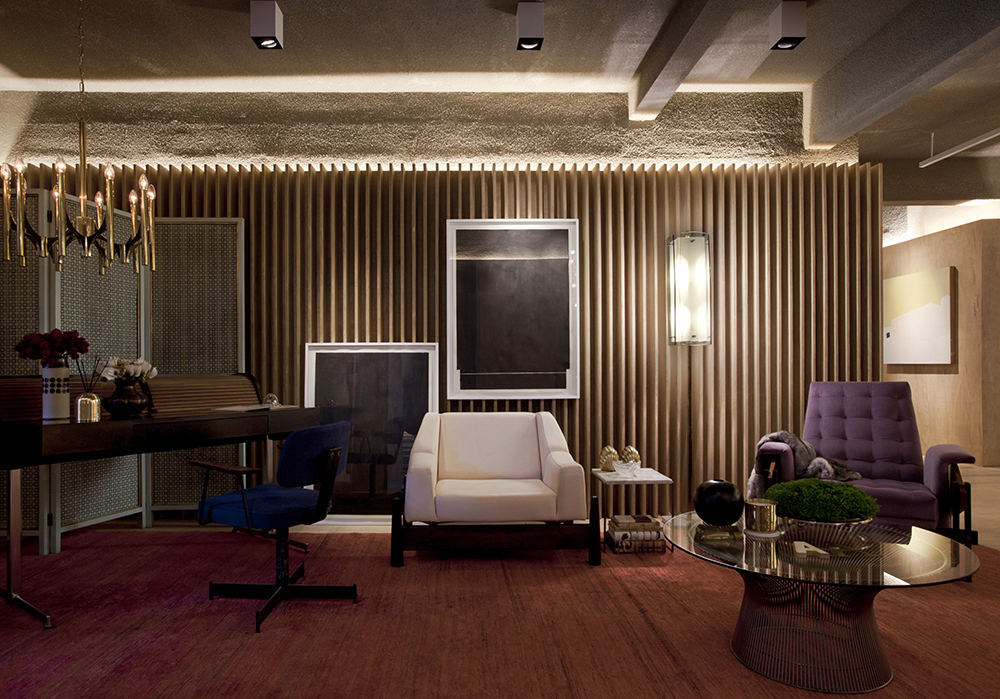 Outro ponto importante é o formato do ambiente, em “T”, que norteia o visitante a analisar e “viajar” pelo espaço e tempo. Obras de de jovens artistas dividem o local com móveis dos anos 1940 e 70, repaginados com tecidos e cores atuais que trazem um conceito high low.
