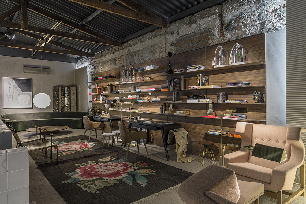1/5 CASACOR Goiás 2016. Biblioteca – Cláudia Zuppani. O galpão foi preenchido por móveis de grande escala e mobiliário icônico, como a estante Jader Almeida, poltronas de Lina Bo Bardi e de Sérgio Rodrigo. No piso, o carpete minimiza os ruídos e contribui para um ambiente de leitura. ()