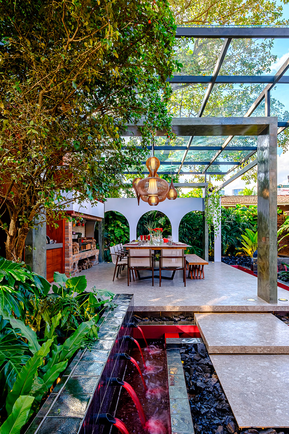 El Rincón del Carbón, este ambiente lúdico da CASACOR Bolívia 2021, faz do jardim um lugar paradisíaco. Os profissionais Alejandra Iriarte, Alejandro Diez de Medina e Carlos Blanco optaram por paredes com tons de cinza e tijolos à vista para abrigar uma churrasqueira de grande porte.