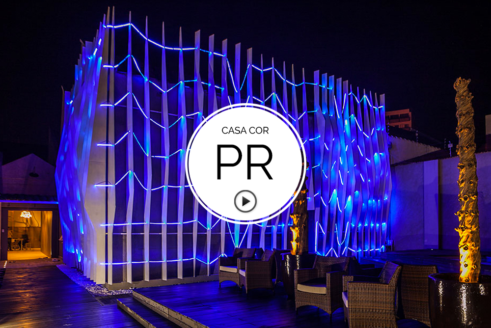 Simone Schulmeister projetou o Jardim, Fachada e Brilheteria da CASA COR Paraná 2015. Sobras de madeira e resíduos plásticos são a matéria-prima do deck, e a cobertura da bilheteria apresenta um telhado verde. Troncos e copas de árvores foram incorporados ao ambiente na forma de esculturas e cachepôs. Outro destaque é a estrutura metálica da fachada, que traz o movimento de uma onda e é iluminada com LEDs azuis. Confira o vídeo feito pela TV CASA COR.
