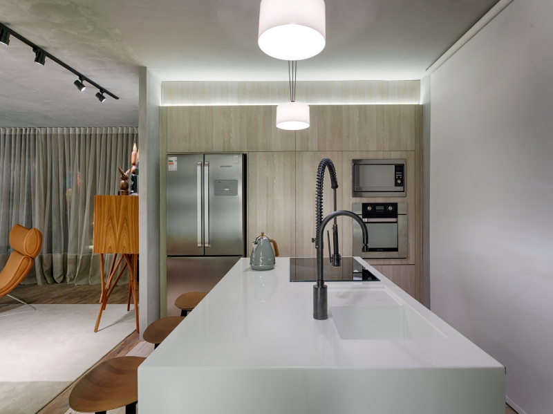 A paleta de cores de tons claros, cinzas e brancos, confere leveza ao espaço. A marcenaria e os bancos se contrastam discretamente com o aço inox dos eletrodomésticos e a bancada branca em Nanoprime.