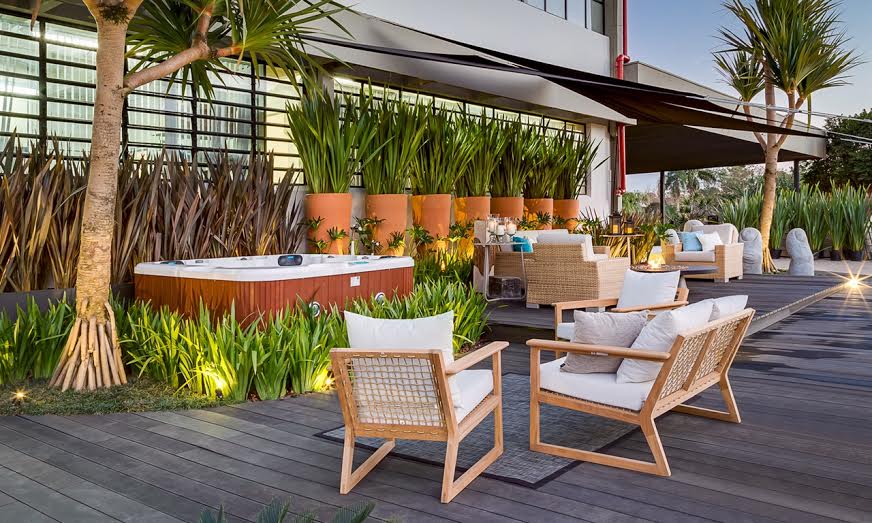 A sofisticação ficou por conta da piscina aquecida e do SPA, ambos da Igui Piscinas. A área de estar é determinada por uma cobertura no estilo tenda e composta por mobiliário especial para área externa em tons mais claros, a fim de se destacarem em meio à vegetação. Na mesa de centro, uma lareira à etanol faz com que o ambiente seja aconchegante também em épocas mais frias.