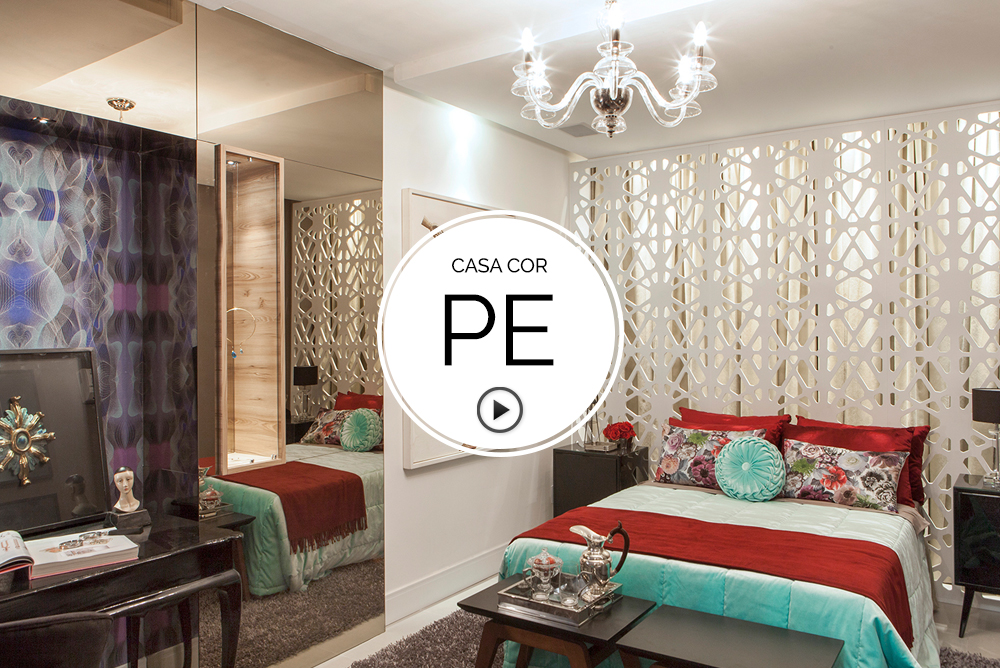 Quarto da Designer por Elizete Benjamin em CASA COR Pernambuco 2015 – O ambiente tem uma pegada contemporânea e cheia de personalidade, utilizando elementos de inspiração árabe, com cores fortes misturadas aos tons aos tons de preto e branco. É marcado por um biombo que faz as vezes de um grande painel em MDF revestido por resina PET. Atrás dele foi aplicada uma cortina clara iluminação indireta para marcar a cena. No mobiliário destaca-se uma bela cômoda negra ladeada por uma sóbria poltrona de couro, que contrasta com as cores fortes escolhidas para o enxoval de cama, confeccionado especialmente para o espaço. Veja mais detalhes do espaço no vídeo feito pelo TV CASA COR ao VIVO.