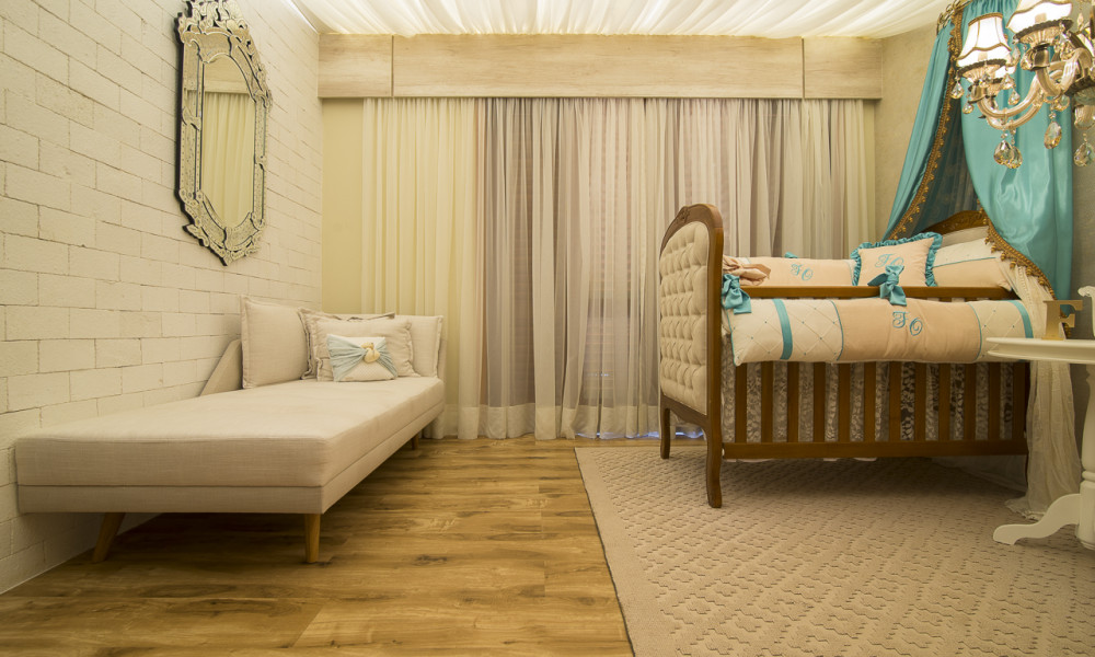 Além da funcionalidade, praticidade, luxo e sofisticação, a profissional teve uma preocupação especial em selecionar materiais e produtos que contribuem com a saúde e o bem-estar de uma criança em seus primeiros anos de vida. Fabiana escolheu o revestimento vinílico da ePiso que imita madeira por que possui conforto térmico, acústico e ajuda a amortecer o impacto em pequenas quedas. O produto também é antibacteriano e não acumula pó. Os papéis de paredes possuem tecnologia now woven, produzidos com fibras de celulose e algodão, e as cortinas são antialérgicas.