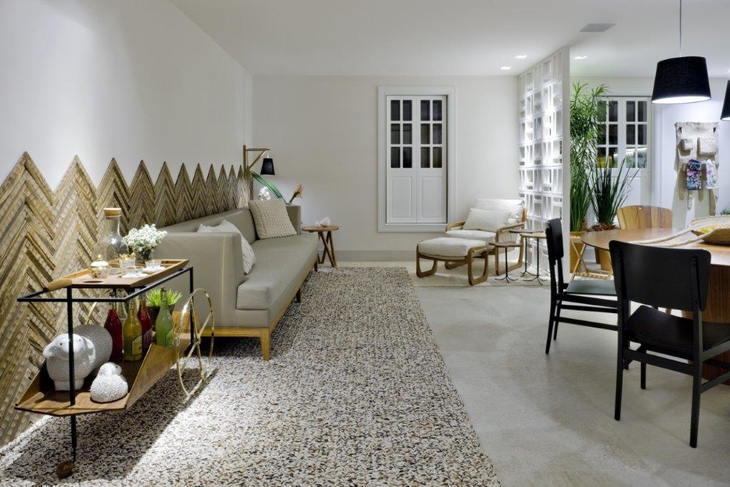 Já a parede recebeu uma azulejaria inspirada no metrô das cidades europeias (Liverpool White Matte e Liverpool Nude Matte). Mas os grandes destaques estão para os cobogós, que ao mesmo tempo que integram, delimitam espaços (Cobogós Elemento Assimétrico e Elemento Simétrico na cor branca) e na parede do sofá foi feito um mosaico com uma linda linha de madeira rica em texturas e relevos, criada na inspiração da marcenaria artesanal (Geppetto Spina Chevron).