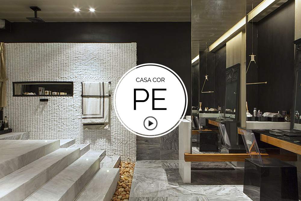 Sala de Banho do Casal por Cândida Glasner em CASA COR Pernambuco 2015 – O traçado em linhas simples reserva soluções funcionais, como o painel de espelho que demarca o espaço da penteadeira. Detalhes em madeira e as pedras na transição para a área da banho aquecem. Veja mais detalhes do espaço no vídeo feito pelo TV CASA COR ao VIVO.