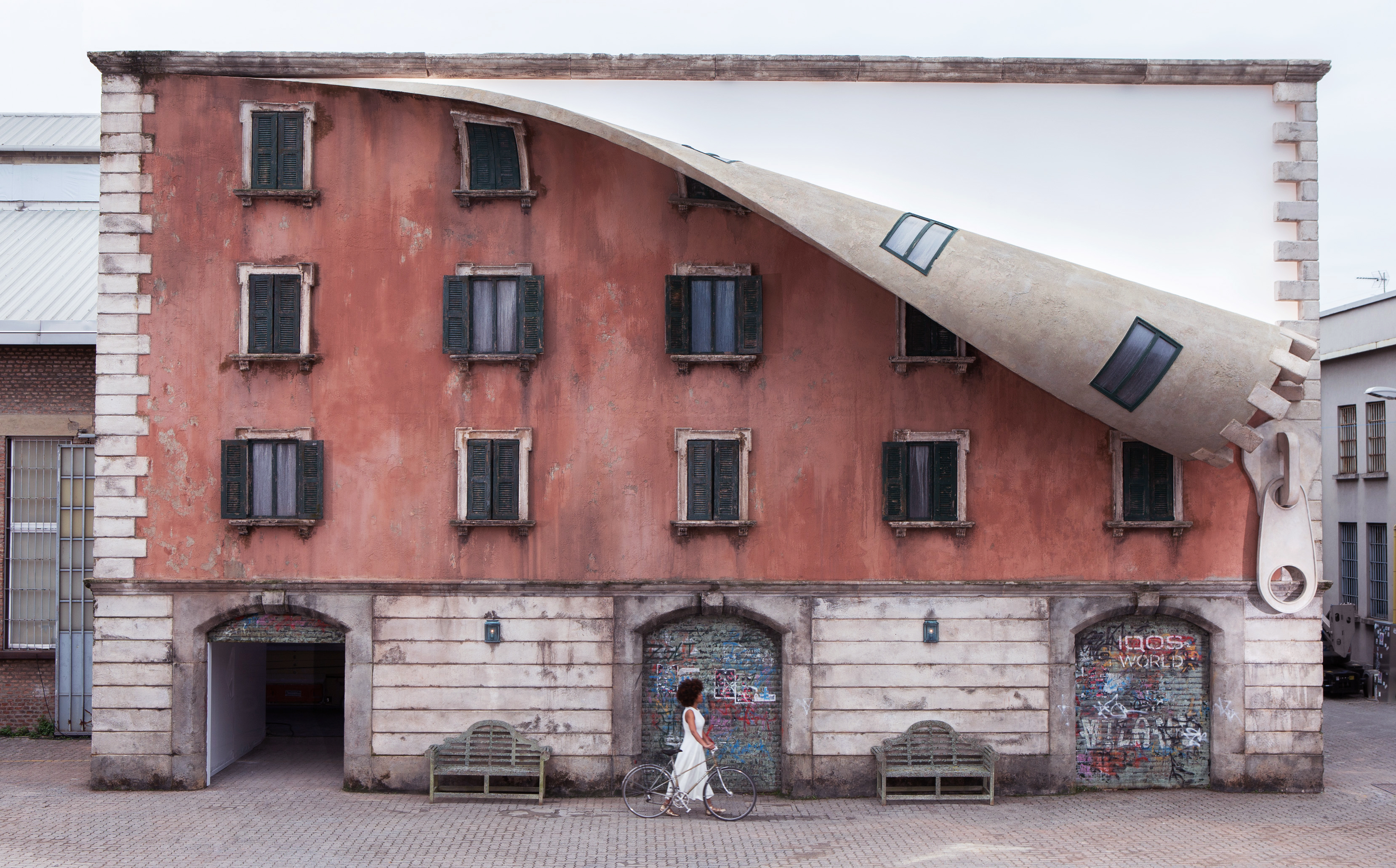 A fachada, que lembra a estética dos prédios de Milão, revela seu interior através do zíper. O ambiente interno também é constituído por aberturas inesperadas no pavimento e nas paredes. O conjunto pode ser interpretado como uma metáfora de transformação, evocando pelos portais o que se parece com infinitas rotas para um novo futuro.