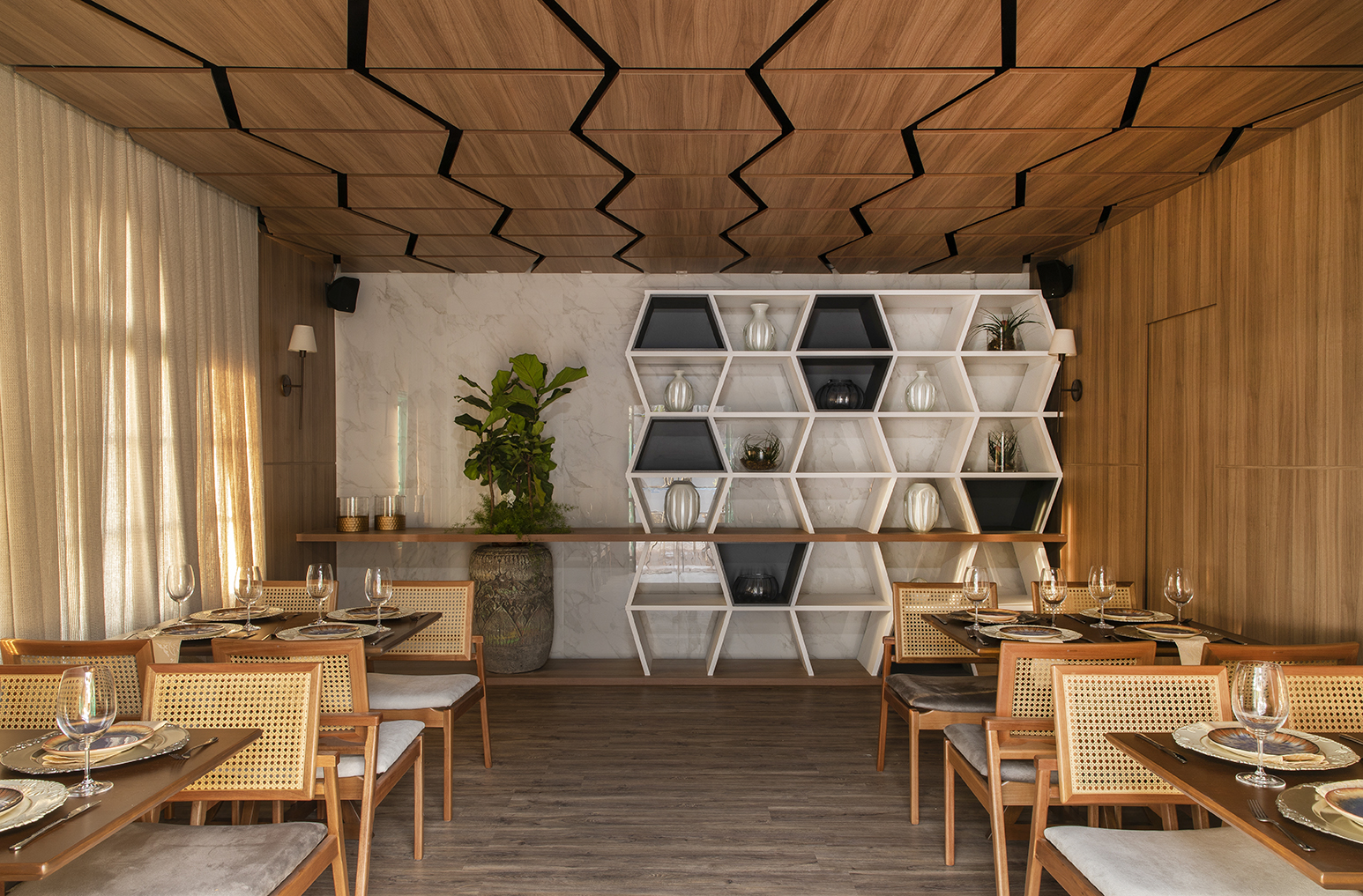 Neste restaurante, a dupla de profissionais se inspirou em uma viagem recente por Milão, Copenhague e Amsterdã para conceber o espaço que mescla ares europeus com brasilidade. A madeira reveste o interior do ambiente. No forro, hexágonos do material compõem um desenho geométrico, que se harmoniza com a estante no mesmo formato. Pedras naturais, tecidos e texturas proporcionam aconchego ao espaço funcional.