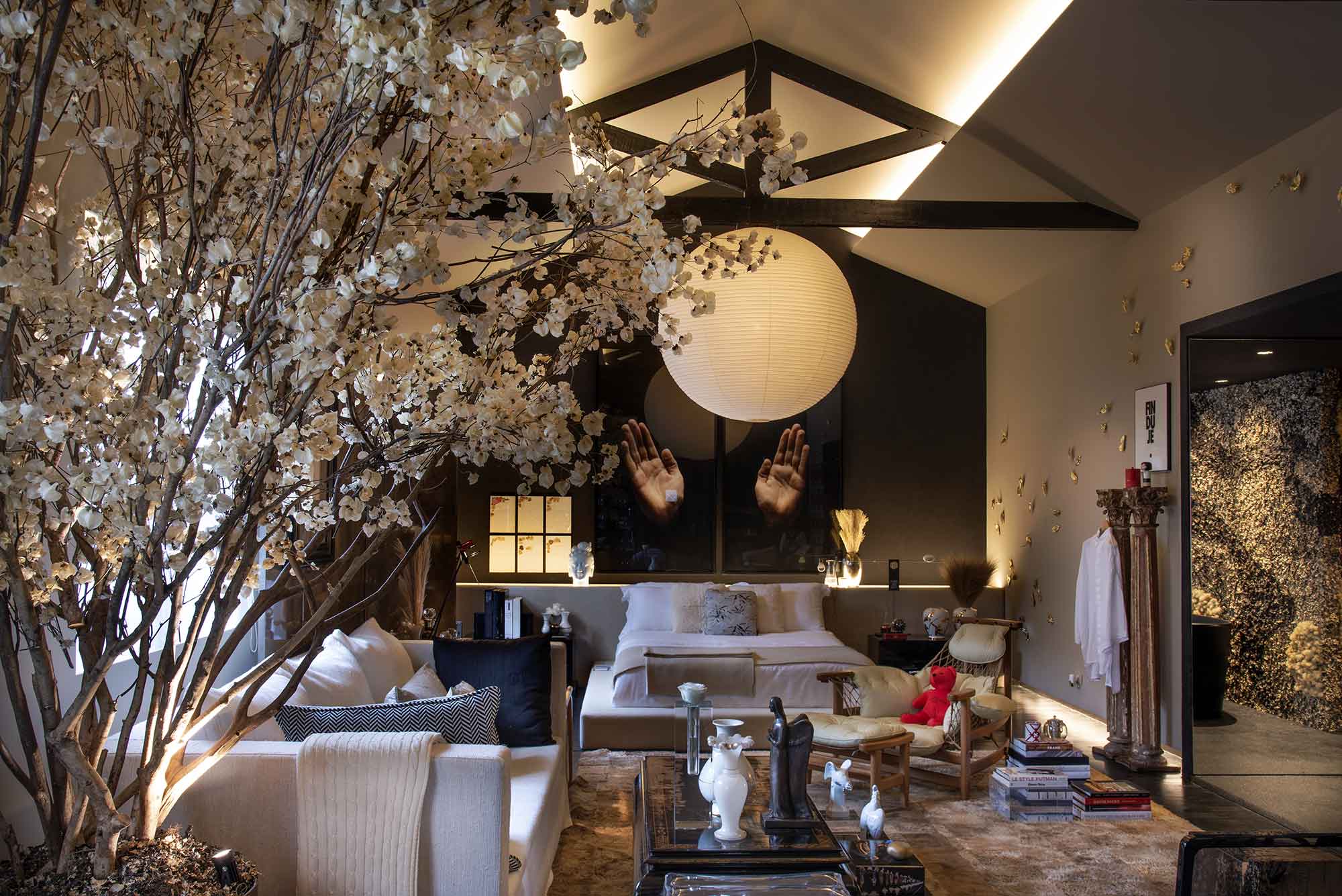 A arte é um caminho pelo qual essa construção é feita. A fotografia de Ruy Teixeira, por exemplo, ganha forma sobre a cama – que na verdade é um estrado em estilo tatame, revestido com seda rústica. As duas palmas, orientadas para cima e incididas por luz direta, evocam certa religiosidade: toque decisivo para consagrar a alma zen do projeto.
