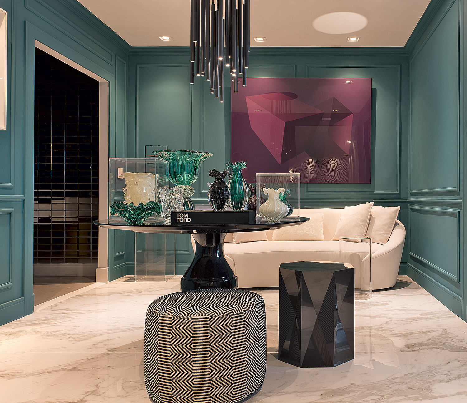 A inspiração do projeto partiu da ideia de criar algo exclusivo e impactante que combinasse diferentes estilos num ambiente único, considerando as tendências de cores e materiais. Nas paredes, tons fortes trazem a modernidade em contraposição à clássica boiserie. A dupla compôs o décor com poucos móveis, todos de design sóbrio, porém diferenciado, como o confortável sofá branco de linhas curvas.