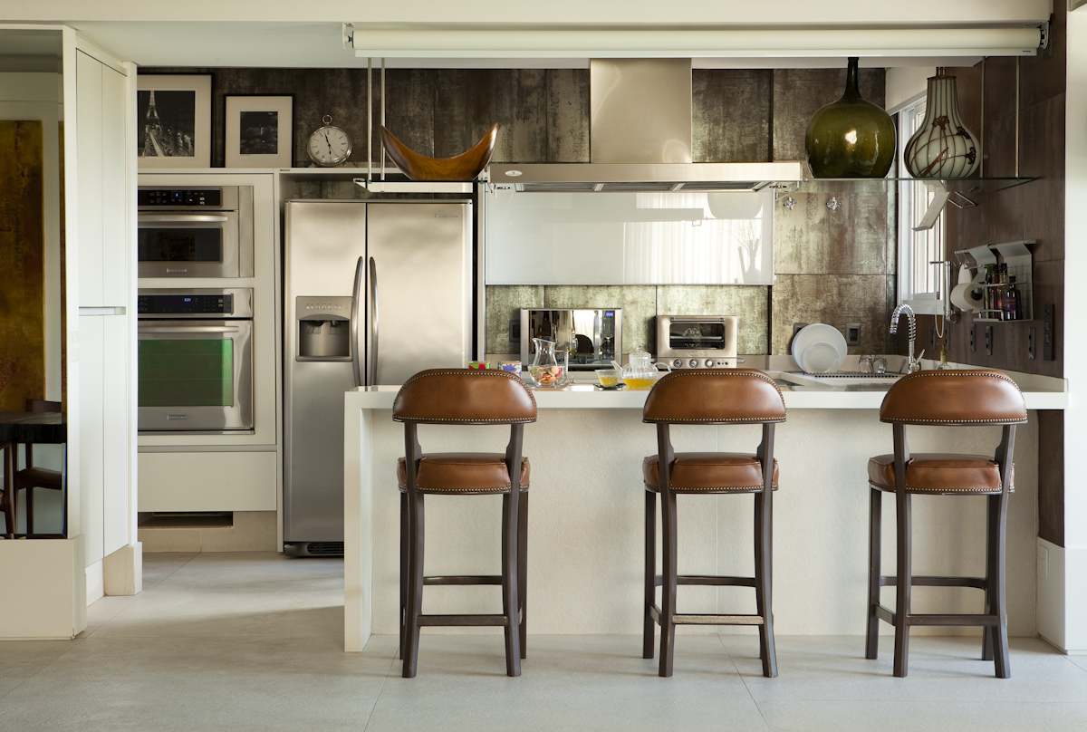 Segundo a arquiteta, os projetos de cozinhas gourmet têm sido cada vez mais solicitados, o ato de cozinhar se tornou um hobby muito apreciado que confere bons momentos de prazer. Para isso, em um ambiente, como o da foto acima, há a mistura diversos elementos, onde o branco predomina e ressalta o metal apresentado em dois acabamentos, inox e o revestimento que simula o efeito da oxidação.