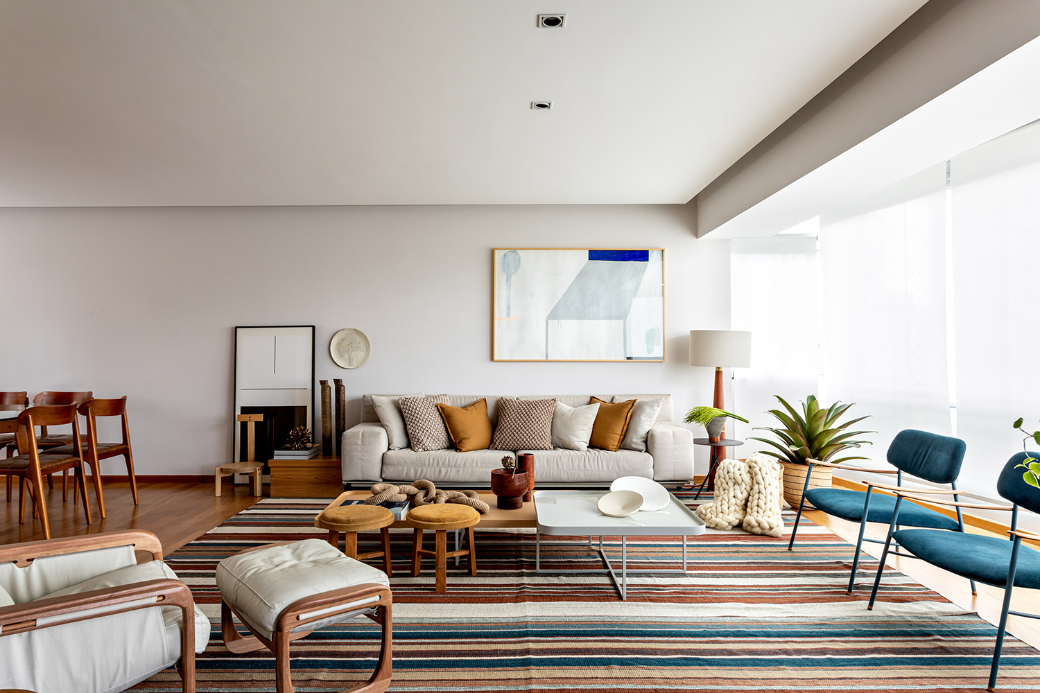 Além de muito espaço para receber, o living ganhou um clima despojado com um grande tapete listrado e vários móveis soltos – o que permite diversas combinações dependendo da ocasião. Repare na composição de mesas de centro diferentes, que também abrigam um prato de cerâmica que o casal recebeu de presente de casamento.