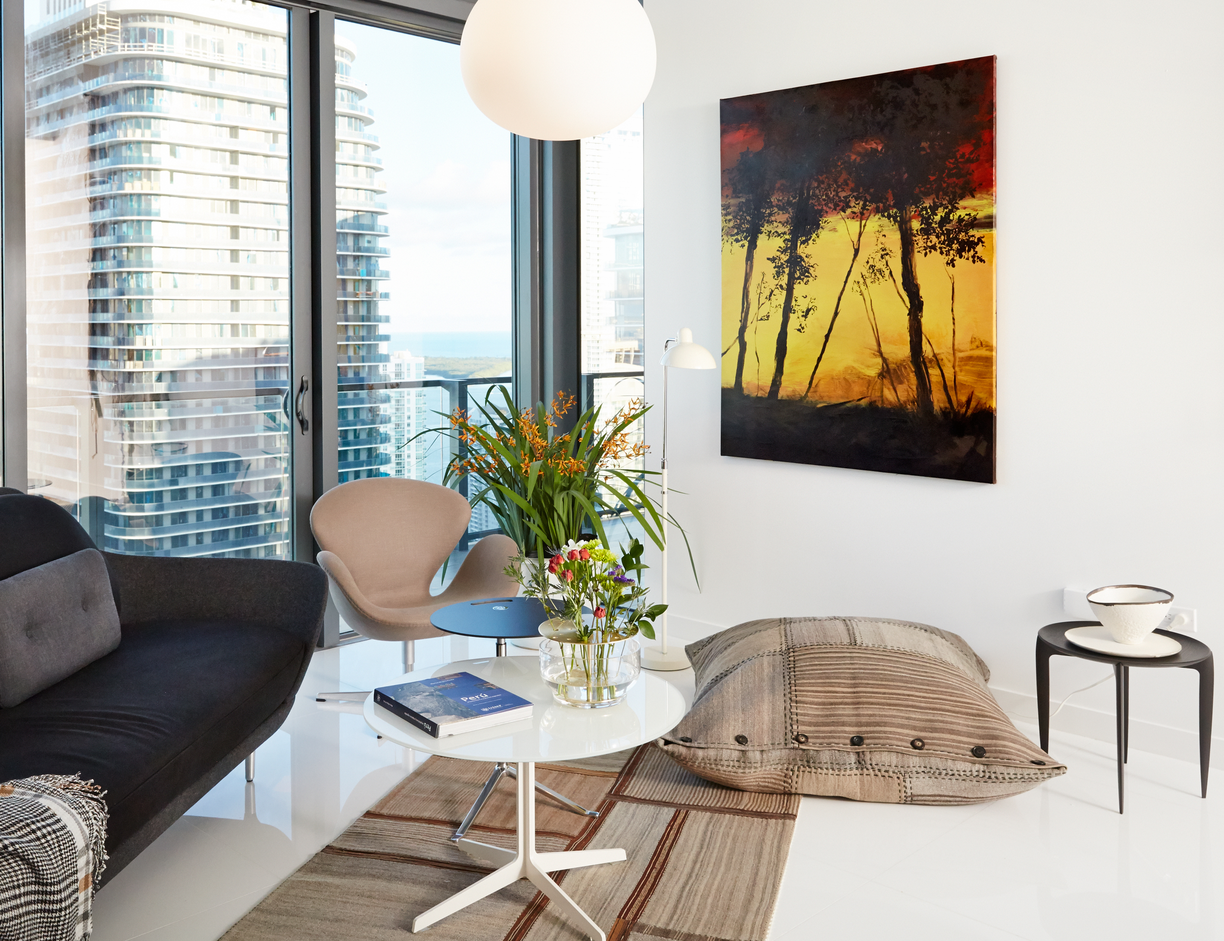 O profissional apostou no contraste das peças elegantes com os tons naturais de lã, alabastro e ouro com as paredes brancas. Obras escuras e ocre envolvem as peças de design contemporâneas, como a cadeira Ro Easy de Jaime Hayon. A cadeira Swan, de Arne Jacobsen, compartilha espaço com um tapete feito de ponchos vintage de alpaca.