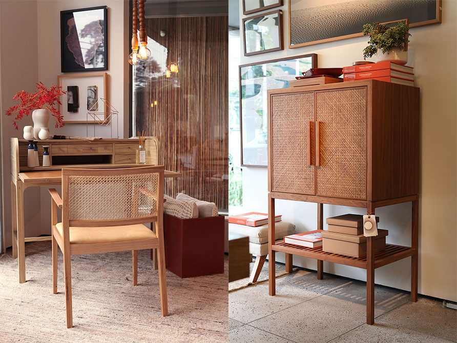 A arquiteta e empresária Isabelle De Mari acaba de lançar (30 de setembro) sua nova coleção de mobiliário para a Olho_Interni. São nove peças, de caráter artesanal, que privilegiam a matéria prima natural como madeira, couro e palha e convidam ao toque. Além dos móveis, a marca apresentou também uma nova gama de objetos e almofadas que revelam toda elegância e apreço aos detalhes. Para a vitrine, a designer Marina Linhares compôs uma bela ambientação com as novidades. Destaque para o painel abstrato de Adriana e Carlota.