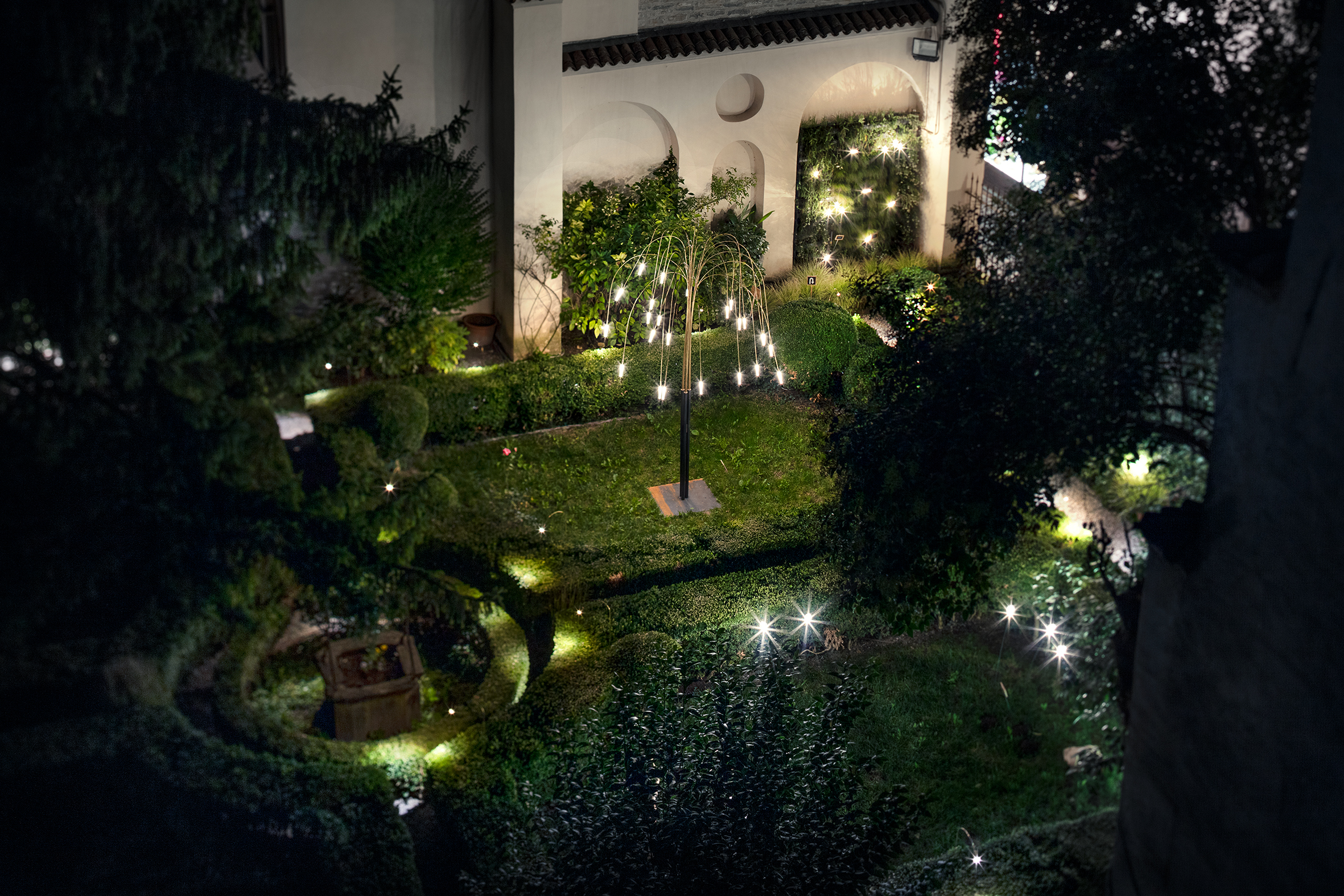 Mas o que chama a atenção dos visitantes é o espetacular Albero di Luce Light, que se assemelha a um salgueiro-chorão, cujos galhos finos de latão balançam ao vento com botões de luz, criando em torno de si um ambiente mágico e acolhedor.