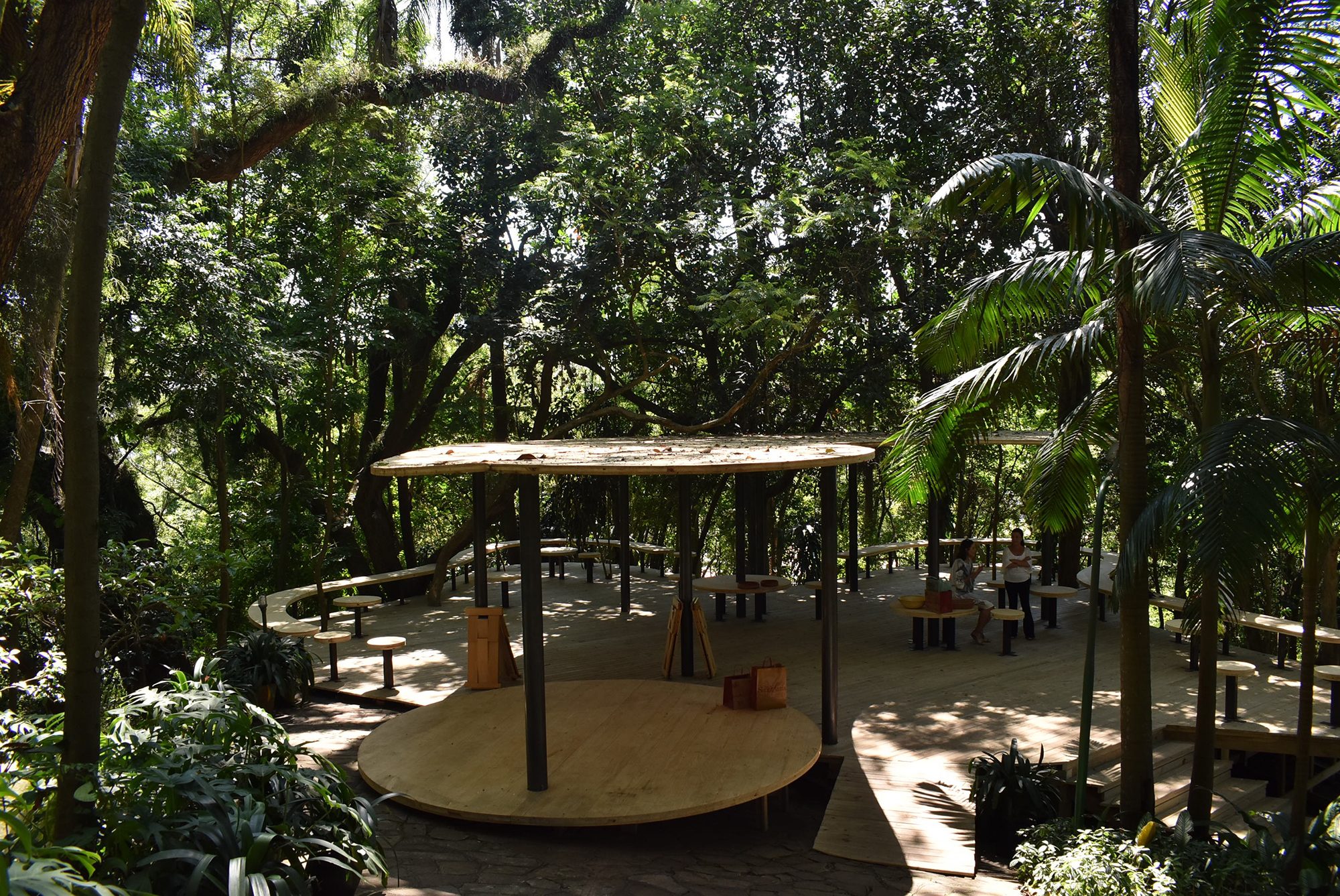 O projeto do Pavilhão foi concebido para se mesclar ao entorno e se incorporar ao terreno íngreme do Morumbi. “Medimos todas as arvores e planejamos uma plataforma, que sobrepassando a rampa de pedra, estendesse-se até o limite das maiores, assim incorporou as menores árvores na própria estrutura e respeitamos cada galho do jardim. Com esse critério, surgiu uma forma orgânica, que respeitava o entorno e ao mesmo tempo conversava com a arquitetura das linhas sinuosas que a Lina projetou para as contenções do jardim, uma forma de ‘ameba’, que parece as aberturas do restaurante da ladeira da misericórdia em Salvador”, explicou Sol.
