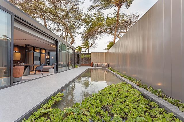 O entorno privativo do espaço é preenchido por um espelho d’água e um jardim aquático, dialogando com o tema de 2018 da CASACOR, A Casa Viva. Praticamente unido a ele está a construção: uma caixa transparente de vidro com portas, que deslizam permitindo a fusão entre interior e exterior. Essa sintonia possibilita uma real experiência sensorial para o ocupante.