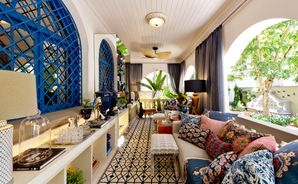 Os arquitetos usam placas com musgo natural importado da Itália, fixadas no teto. E para completar o charme, vasos simétricos, compondo com a vegetação que toda varanda necessita, além do uso inusitado de uma estante com linhas contemporâneas, para acomodar o acervo e itens que o morador mais gosta. Lanternas e velas dão aconchego e conforto, e ventiladores de teto com fibra natural, feitos sob medida, vão refrescar o ambiente.
