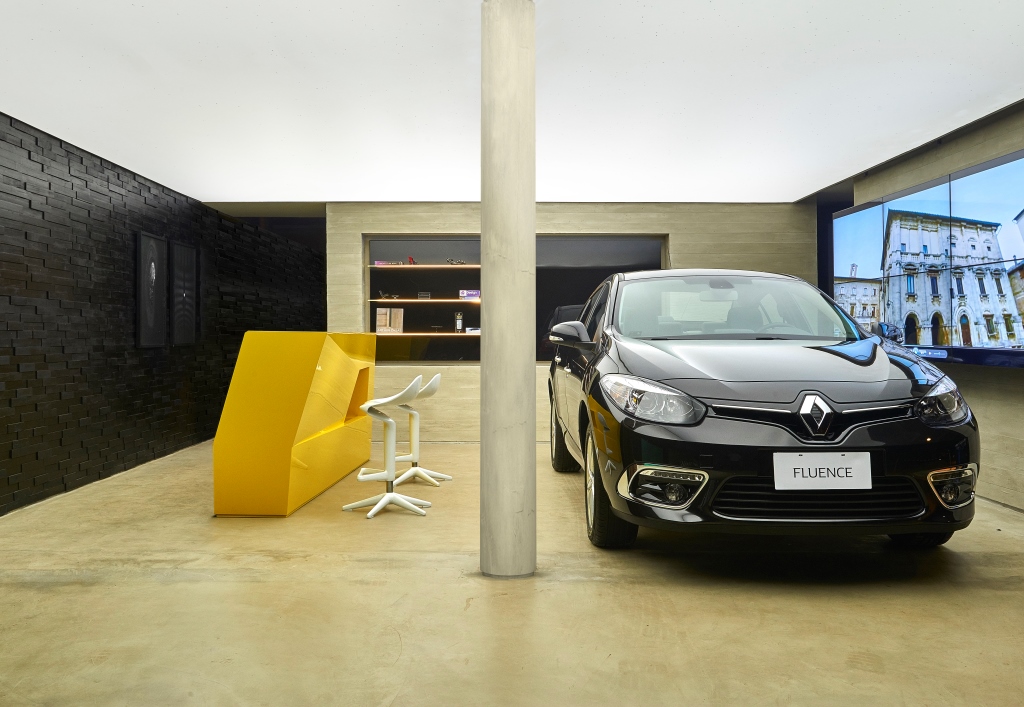 Como alternativa, em vez de ficar parada entre o balcão e o ‘video wall’, o Novo Fluence também fica estacionado próximo à parede revestida de mosaico de madeira teka, com acabamento ebanizado.