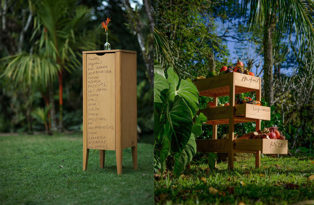 Foram duas coleções “Livro em Louças” e “Flutuantes” lançadas juntas em 2013. Agora lanço as coleções “Rito” e “Afeto” e alguns complementos das duas primeiras linhas. Na “Rito”, procuro falar da importância dos rituais. Acho que um dos nossos grandes problemas civilizatórios é atravessarmos a vida sem ritualizar. Comemos um sanduiche em pé, e esse é nosso almoço. Não ritualizamos nosso acordar, não ritualizamos o nosso dormir, nem o nosso comer. Esse é um problema civilizatório. Em toda a aldeia, seja uma aldeia indígena, seja uma aldeia de uma cidade pequena as pessoas tem um outro jeito de viver. Sei lá, toca o sino e as pessoas se levantam e olham para céu. Acho que estamos perdendo isso e perdemos muito com isso. De uma certa forma, os meus objetos tem um compromisso comportamental, que a partir da sensibilidade da textura e da poesia, e da poesia que não vem só das palavras mas também vem da forma e da pessoas sentir que aquilo foi projetado para ela se sensibilizar. Eu chamo essa linha de Rito pois espero que as pessoas possam ritualizar o seu dia a dia. Meus objetos tem esse objetivo de gerar uma experiência comportamental nova. Por exemplo: quando eu falo de uma fruteira que é um porta raízes, legumes e frutas que é um móvel eu estou dizendo: ‘ – se liga ai, você não precisa guardar tudo na geladeira, as coisas tem seu tempo certo de amadurecer’.